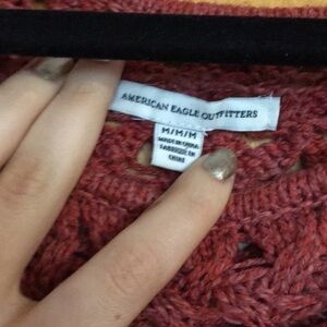 This rust colored high low sweater has 3/4 sleeves and is a large chunky knit.