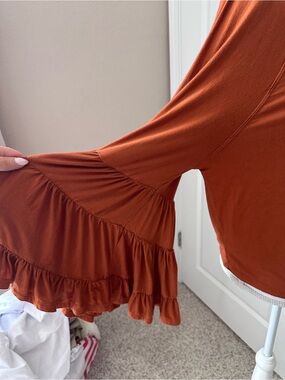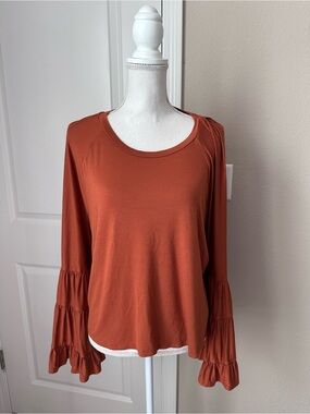 A soft, rust-colored long sleeve with the perfect bell sleeves! It also has a cute folded detail on the shoulders. This would be great for a country concert! Shirt is stretchy and comfortable.