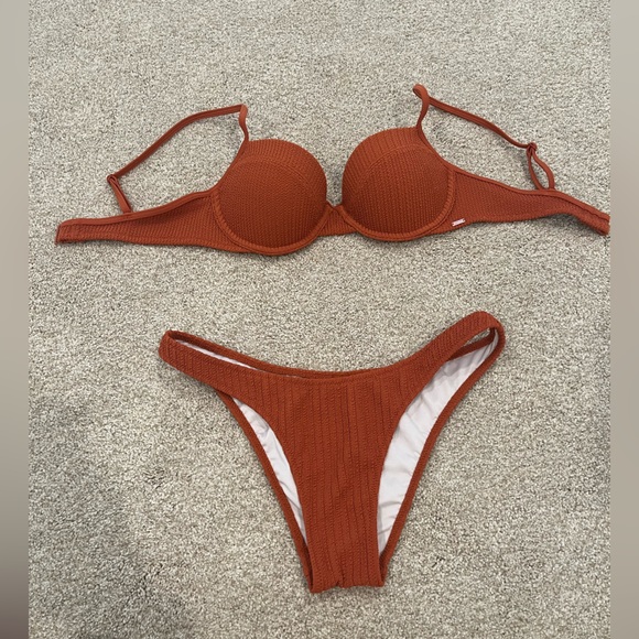 Stylish rust bikini set perfect for a day at the beach. Features a textured design. PINK by Victoria’s Secret brand. Size small. Preowned in excellent condition, only worn once.