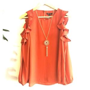 Solid waist length top relaxed fit with boat neckline ruffled cold shoulder sleeves, accent necklace attached