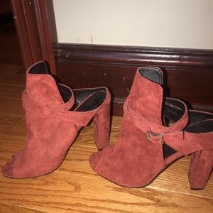 Beautiful, never worn open toe rust colored booties with cute ankle clasp and a chunky heel! So comfortable to wear and perfect for all seasons!