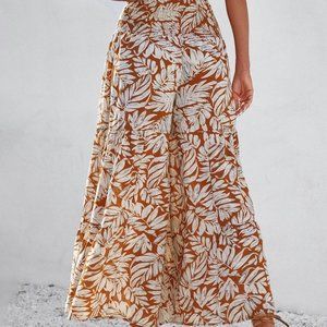 Rust Brown Boho Womens Plants Print Belted Wide Leg Pants