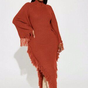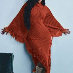 Rust Brown Casual Women's Fringe Trim Batwing Sweater maxi Dress