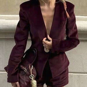 This women's set in rust brown featuring a velvet slim‑fit blazer with a deep V‑neck and matching short pants. The set offers a casual yet elegant chic look, perfect for spring and fall.
