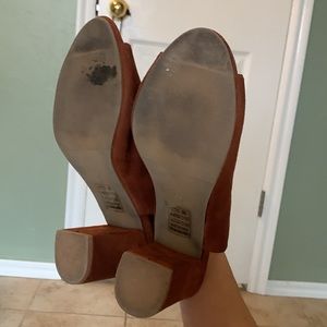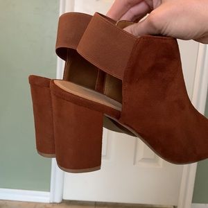 Beautiful rust brown peep toe heel with elastic strap and block heel