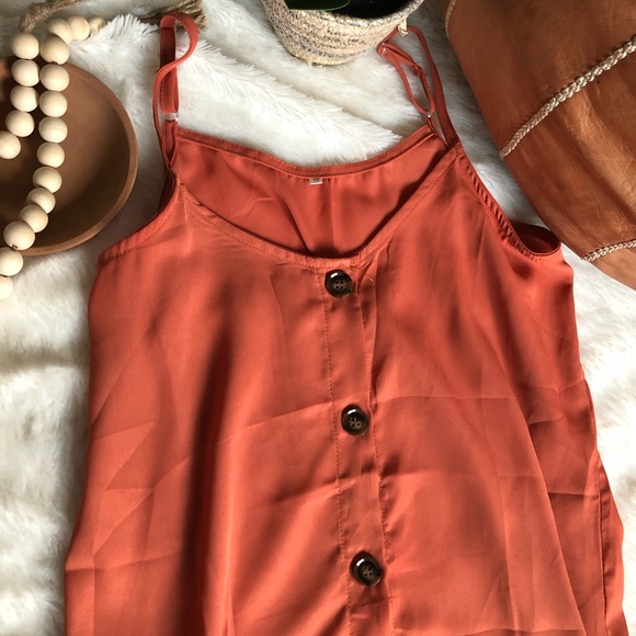 Such a beautiful rust button down sheer tank top! Perfect for when the weather starts to get warmer! Looks so cute with a bralette as well! Comment if you have any other questions!