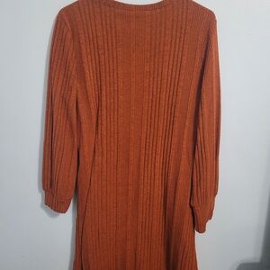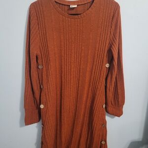 Elevate your wardrobe with this chic rust dress. Featuring a ribbed texture and stylish button details, it's perfect for any occasion. Plus, it has pockets!