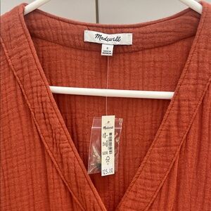 Madewell (new with tags) Stylish rust-colored button-down jumpsuit with short sleeves and a V-neckline. 100% cotton