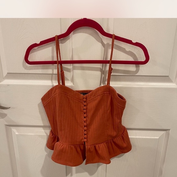 Elevate your style with this rust crop top featuring a charming button-front design. Perfect for casual outings.