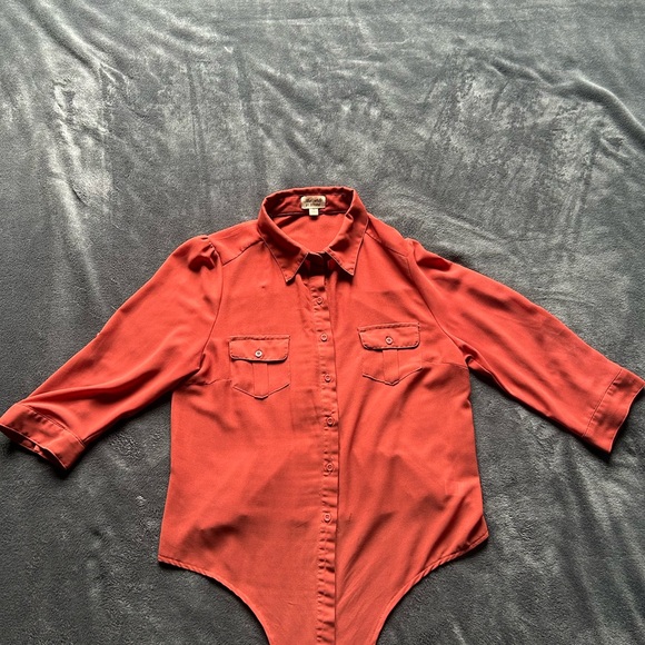 Stylish rust-colored button-up bodysuit with chest pockets. Perfect for a chic look. NO PETS/SMOKING
