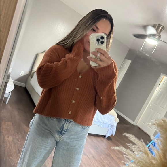 Cozy rust-colored cardigan with button-up front. Perfect for layering.