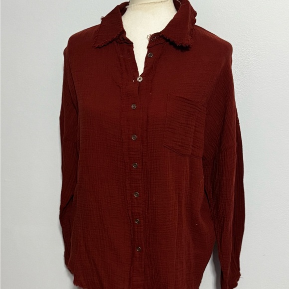 Stylish rust button-up shirt with a textured design. Features a front pocket and frayed collar.