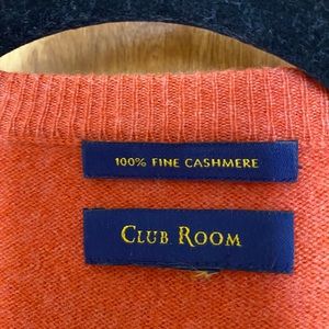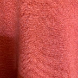 A beautiful shade of burnt orange, I consider this sweater for men or women. There is no size tag. On a woman, this would fit from small to large, depending on how cozy you like your cashmere. I believe it’s 2 ply cashmere. No holes or snags. There is one dark place about the size of a nickel on the front, barely noticeable. I haven’t had this sweater dry cleaned. Possibly removed with cleaning.