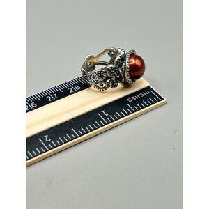Tags: Rust Color ring, Pearl Ring, Size 4 ring, size 5 ring, small size ring, Israel Didae 925, Ornate Filigree, Pearl Cabochon, red cabochon ring, costume jewelry, lava ring, statement ring