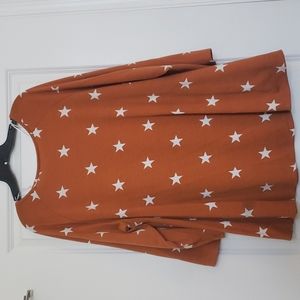 This rust color 3/4 length sleeve flared top goes great with leggings and ankle boots. Material is very soft and I would say on the warmer side. I removed the tags a while ago so I can't say with a certainty where it came from but I'm 95% sure I got it at Torrid.