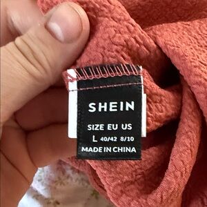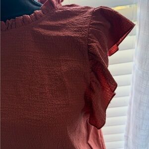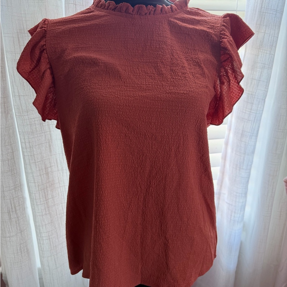 This adorable rust-colored SHEIN top is the perfect statement piece for fall or year-round layering. It features soft textured fabric with feminine ruffle detailing along the sleeves and neckline for a flattering, elevated look.