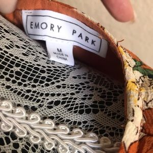 Emory Park rust colored floral romper. Size is Medium, fits like a Petite 4. It has an unattached belt tie, and a small snap closure at the chest. The longest part of the front and back hem ruffle is 15” from the waist seam. Back zipper.