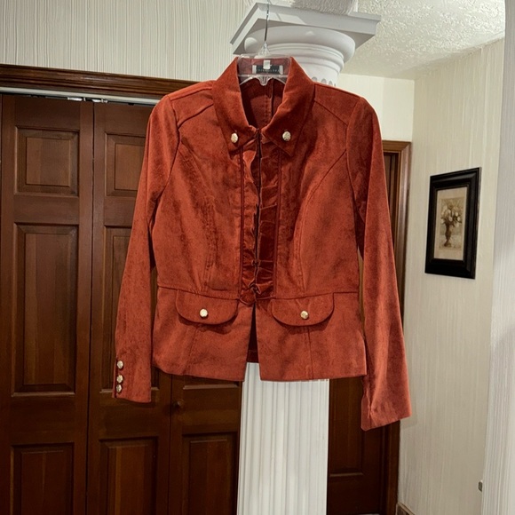 Gold hardware. Front faux pockets. Hook style closures.Padded shoulders.