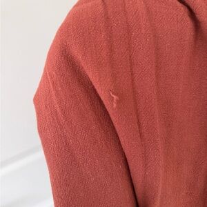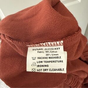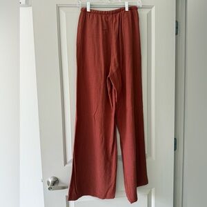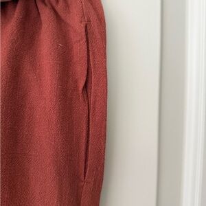 Lightweight wide-leg pants in a warm rust tone. Size small. 70% cotton & 30% linen. Elastic waistband with drawstring. Small snag on the front, featured in the photos