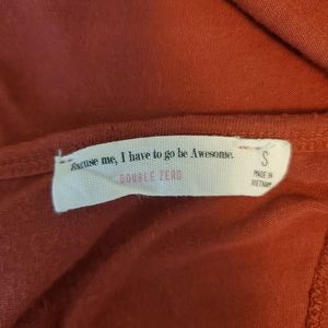 Sleeveless, round neck tank top with open back. Super soft Rust colored fabric- 95% Rayon, 5% Spandex. Excellent pre owned condition. Hand wash cold, hang to dry. Size Small. Length: Approximately 25".