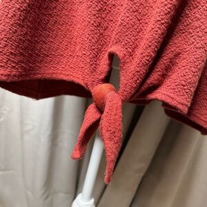 This rust colored top offers a relaxed fit with a stylish tie front detail, making it perfect for casual wear. The short sleeves and soft fabric ensure comfort throughout the day. Size 3X made of rayon polyester and spandex. Button at the back of the neck with keyhole opening. 25 inches long. 60 inch bust measurement. Measurements are approximate.