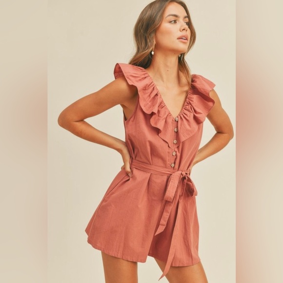 This beautifully ruffled romper is the perfect addition to any wardrobe. This romper is the perfect clay color sand all the right details from the button front to the top back tie.