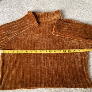 Burnt orange velour turtleneck sweater. Size medium but runs small so I listed as a S. Full length on me (a small). Measurements in photos. No flaws, smoke free home.