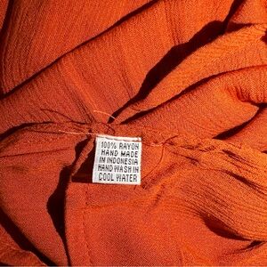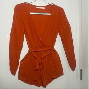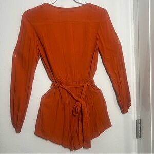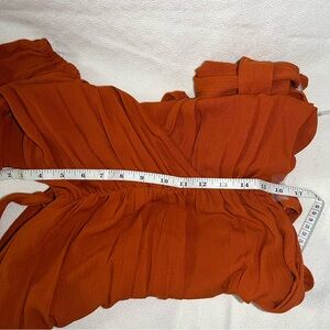 Elegant rust/burnt orange romper featuring a dramatic low V neckline with a discreet clip closure at the bust for secure coverage. Designed with a defined waist tie and soft drape that creates a flattering, feminine silhouette.