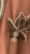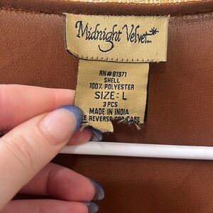 Chic rust open cardigan with detailed embroidery. Features floral patterns and decorative trim.