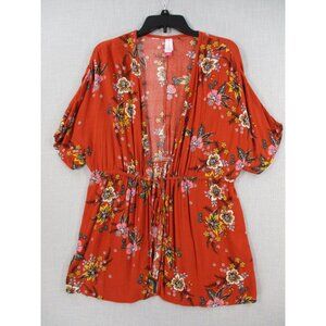 A versatile layering piece designed with professional sophistication. The rust-colored rayon fabric features an intricate floral print with delicate yellow, pink, and white blossoms, creating a refined yet artistic aesthetic. Kimono-style sleeves and a cinched waist provide a flattering silhouette suitable for transitioning between office and evening settings.