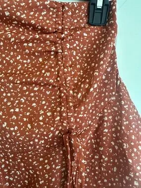 Flirty mini skirt with layered ruffle hem. Side tie detail for a playful touch. Tiny white floral print on a warm rust base. Lightweight, breezy fabric. Easy to dress up or down.