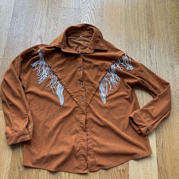 Stylish rust button-up shirt with fringe detailing. Perfect for adding a touch of flair to your wardrobe. Worn once to cowboy Carter tour!