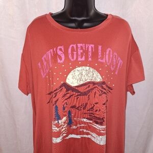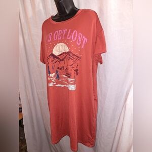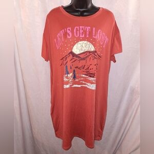 Rust-colored night gown with pockets featuring a mountain graphic and 'Let's Get Lost' text in pink. pit to pit size is 28" top of shoulder to bottom hem is 37.5 " bundle more items for bigger deals Bin-131