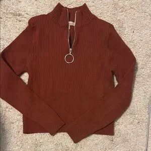 Stylish rust-colored ribbed sweater with a half-zip design and ring pull.