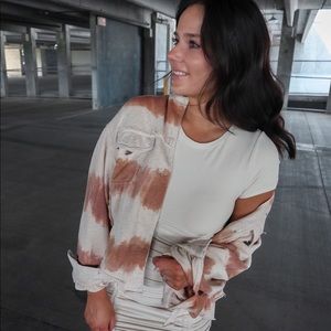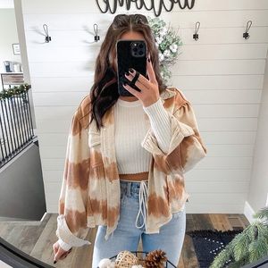 This jacket features a tie dye pattern with a boxy, oversized fit! It has terrycloth paneled sleeves and a raw hem.