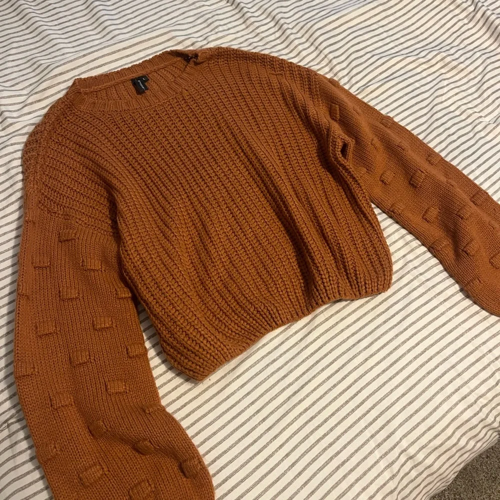 Cozy rust knit sweater with textured sleeves. Perfect for fall.