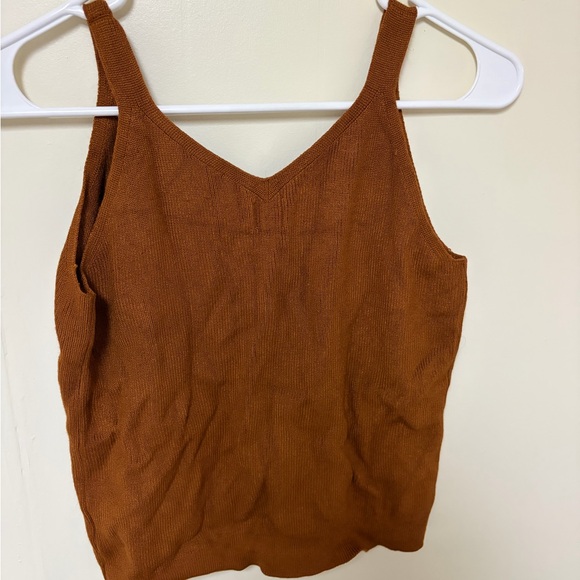 Elevate your casual style with this warm brown knit tank. Perfect for layering or wearing on its own, it offers comfort and versatility. From Target, v neck detailing in front and back