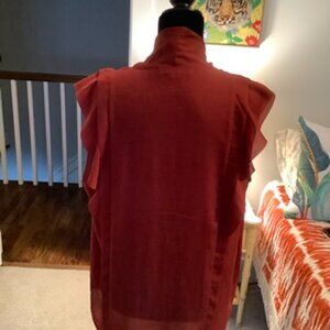 Great color! Button up, tie neck sleeveless ruffle blouse in fabulous rusty terracotta color.