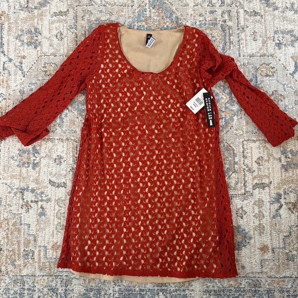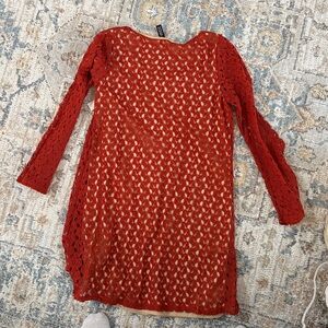 Elegant red lace overlay dress with a scoop neckline. Perfect for any occasion.