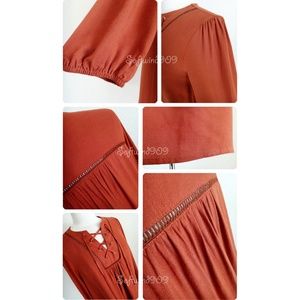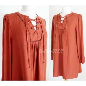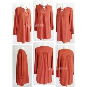 Rust Laced Up Long Sleeves BOHO Flowy Shift Dress