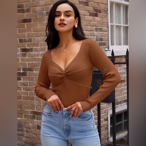 Stylish rust-colored ribbed top with long sleeves. Features a flattering neckline.