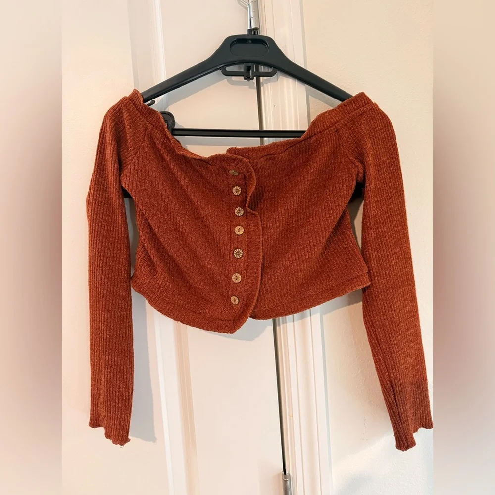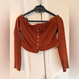 Stylish rust-colored off-shoulder top with button-up front. Perfect for casual outings.