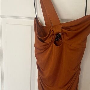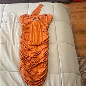 Stylish one-shoulder dress in rust orange. Features elegant ruching and cut out detail