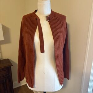 Stay cozy and stylish with this gorgeous rust open-front sweater. Perfect for layering, this sweater adds a touch of warmth to any outfit. Some slight wear as shown in photos. Otherwise great condition 🍁