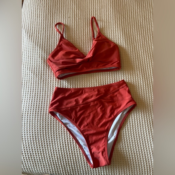 Adorable bikini set with super flattering high waisted bottoms and twist front top with adjustable straps, only worn once.