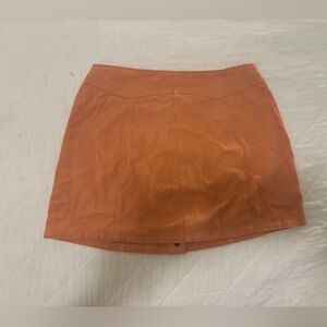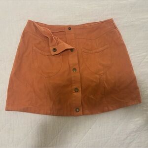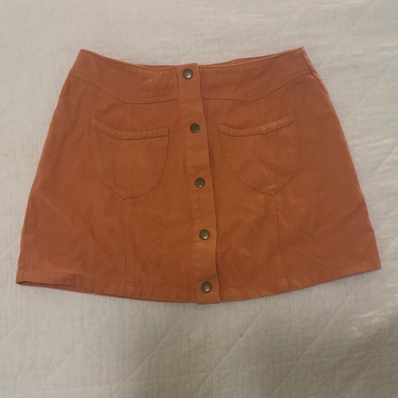Stylish orange mini skirt with button-front design. Features two front pockets.