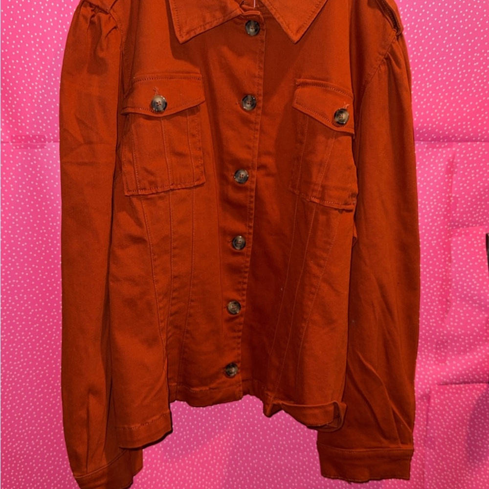 Stylish rust orange jacket. Features button-up front. Two chest pockets. Perfect for layering.