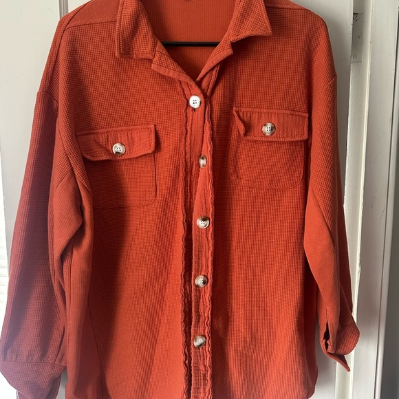 Stylish rust orange button-up shirt with front pockets. Features white buttons for a classic look.