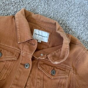 Stylish rust orange denim jacket with button closure and chest pockets.