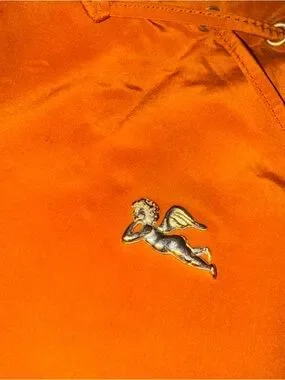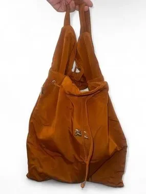 Rust orange drawstring backpack with adjustable shoulder straps. Simple silhouette with small metal logo on front. Lightweight and versatile for everyday use.